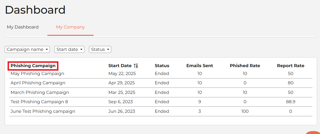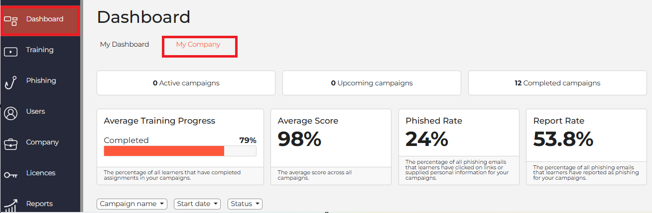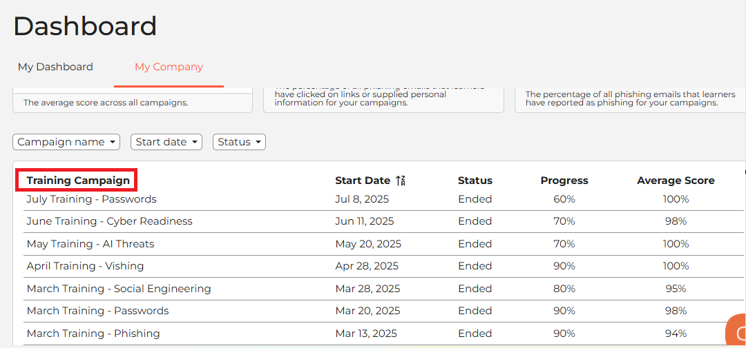 Managers can easily monitor and review the company's overall progress, performance and results for all upcoming and completed training campaigns from their Admin Dashboard.
