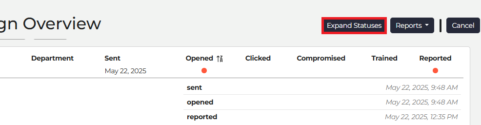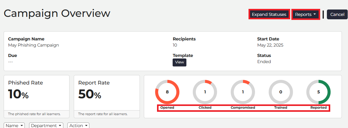 Note: If you need to share campaign progress with department managers without giving them full platform access, download the report as a CSV, filter it by department, and share the filtered file. This applies to both Phishing and Training campaigns, so each manager sees only their team’s progress.