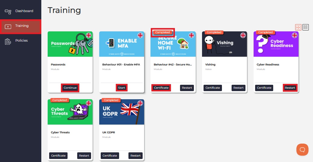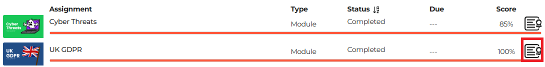 Once you’ve completed a training assignment, you’ll earn a certificate of completion. You can download and print it directly from the dashboard:
