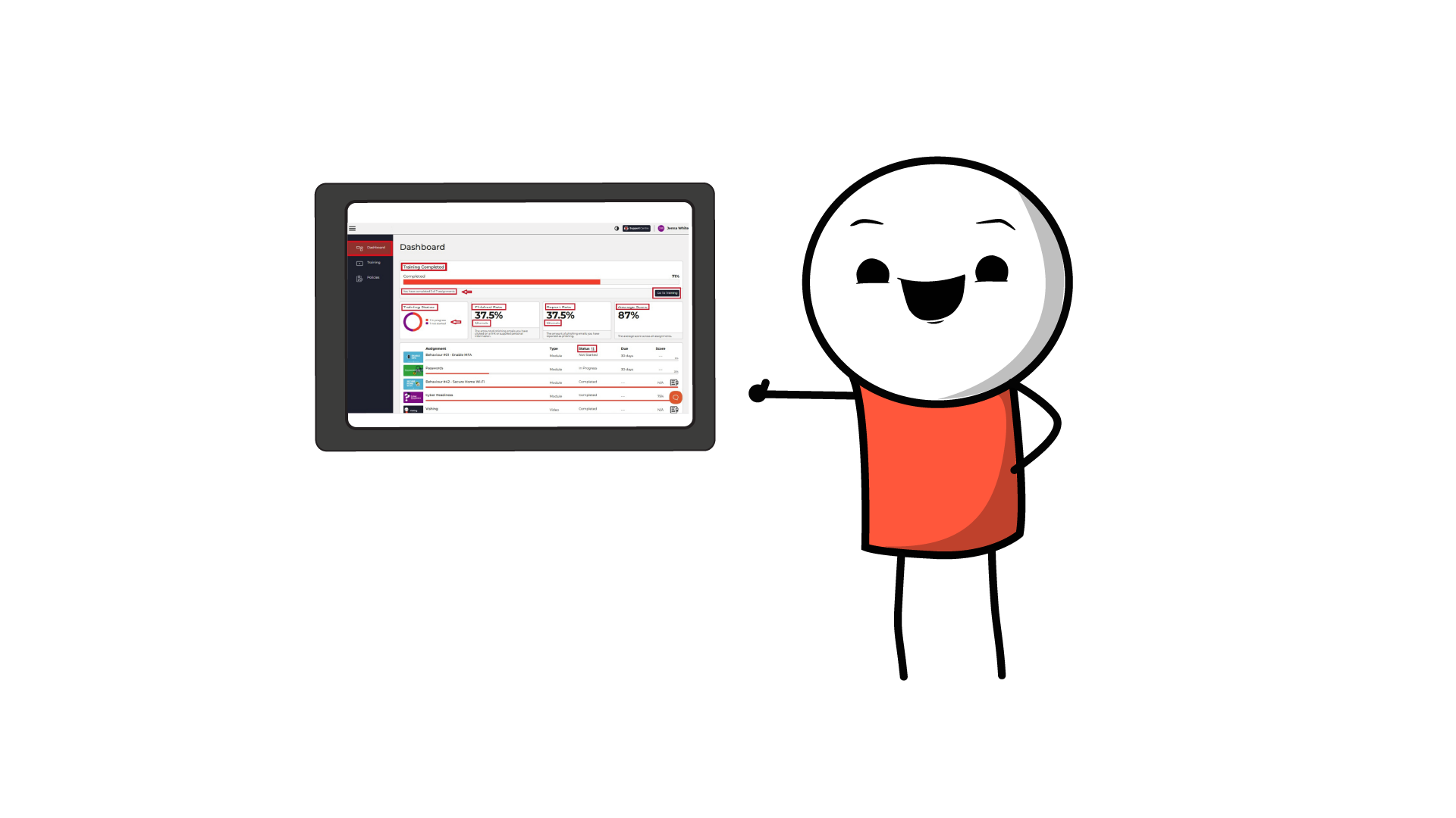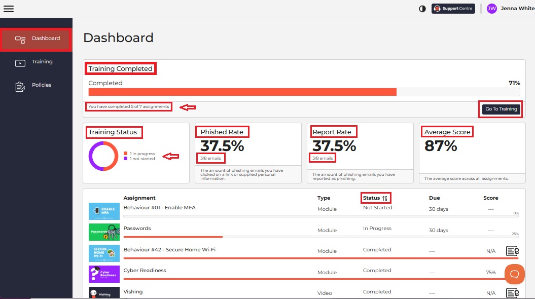 The Learner Dashboard gives you a clear view of your training progress, incomplete, upcoming assignments, as well as your phishing results.