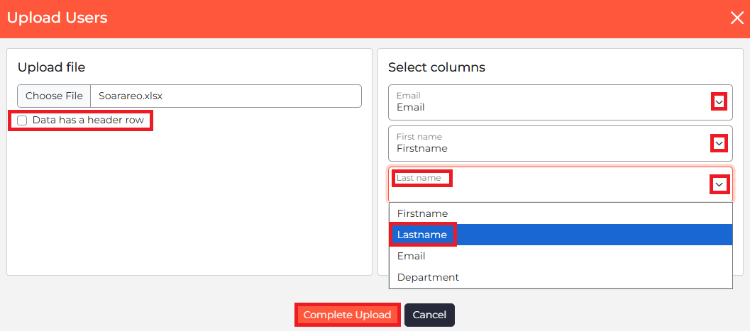 The easiest way to add learners is by uploading a CSV or Excel spreadsheet. No special formatting is needed; simply upload the file provided by your HR team and map the relevant fields.