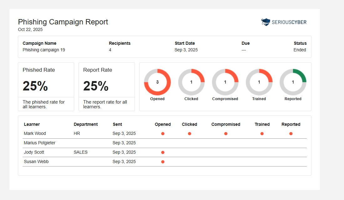 - Identify learners or departments who need extra phishing awareness training.