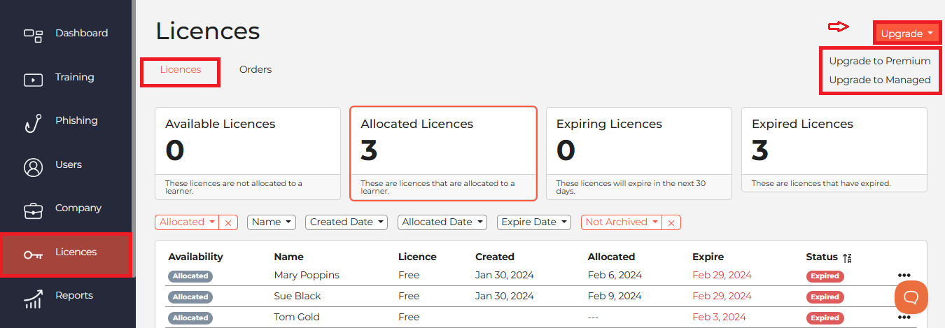 - Automatic Re-licensing: When the next sync runs, if the "Existing Learner" record is maintained AND an available Premium Licence exists, the platform will automatically re-licence that user. This replaces the need for manual allocation in the Expired Licences tab.