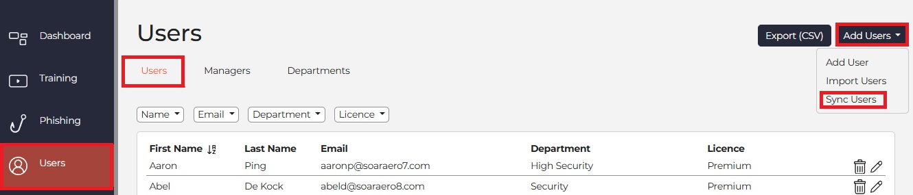 - In the Platform, navigate to the Users section, click Add Users >, and select Sync Users.