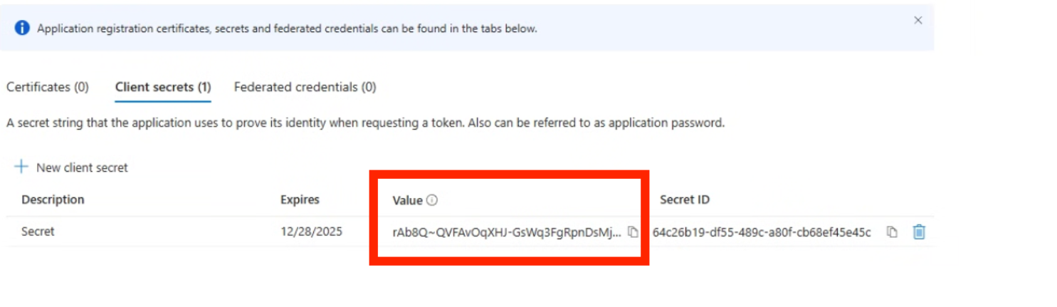 - Temporarily copy the newly created client Secret Value into the text file from step 6, NOT the "Secret ID". You'll need to input it into our Platform later.