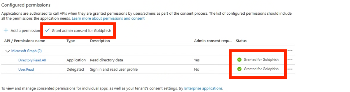 - Finally, select API Permissions, click Grant admin consent for... to finalise the setup. *The status will then change to Granted.