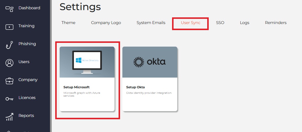 - You will be taken to the Settings > User Sync section. Click the Setup Microsoft.