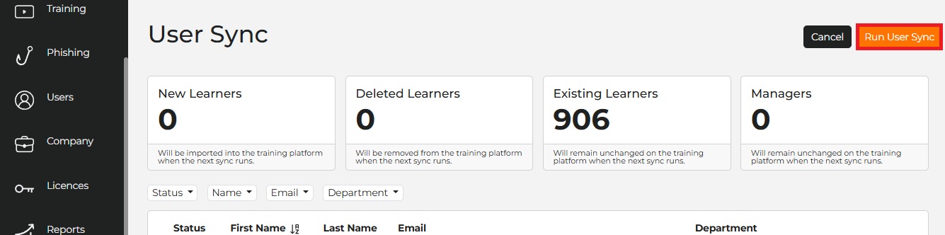 - Deleted Learners: Learners that currently exist on the Platform but don't appear in your Active Directory. They will be removed from the Platform when the next sync runs.